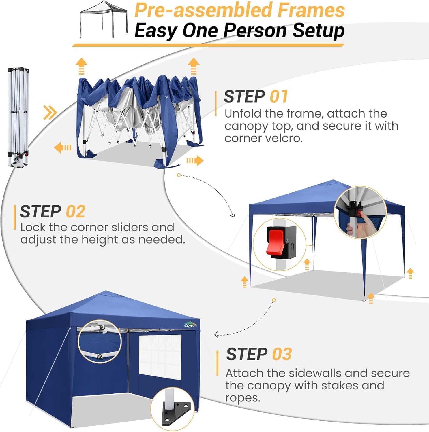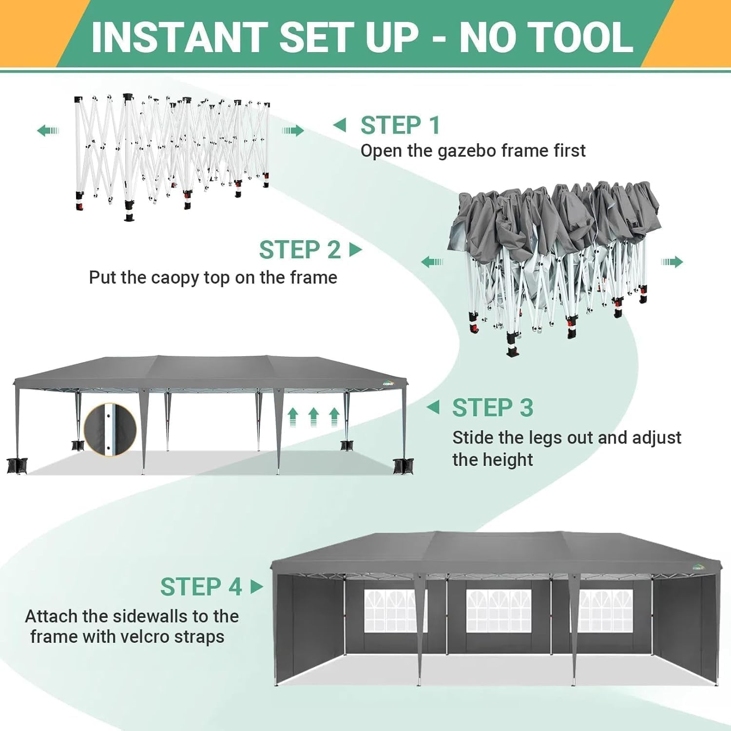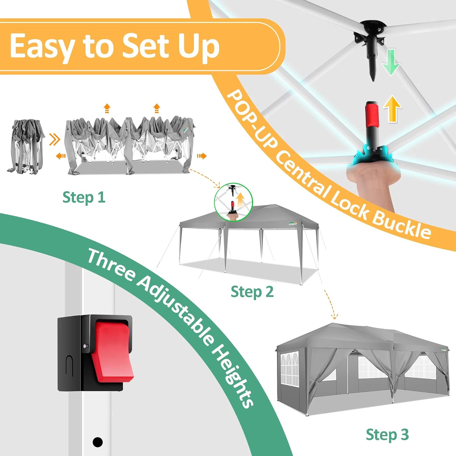• 【Spacious 10x20 Pop Up Party Tent】This extra large 10x20 tent for party with sidewalls offers a generous 18 square meters of shade, comfortably accommodating 10-15 people. Perfect for outdoor events, picnics, and gatherings. The outdoor canopy features 3 adjustable heights: 74 inches, 76 inches, and 79 inches, ensuring it meets your needs for any occasion.